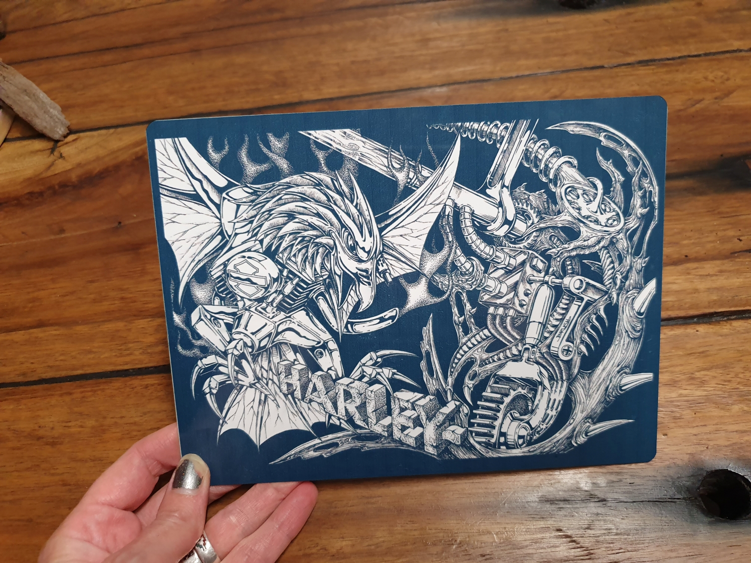 Size A5 sign printed with Brush Taylor’s original Harley themed artwork entitled ‘Evolution Future’. Black and white print. lightweight and easy to hang.